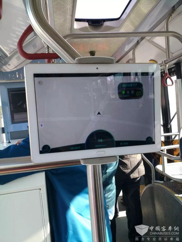 在驾驶座后方,一个黑色显示屏实时显示车辆行驶路线。车辆行驶中,一个类似lpad的显示屏挂在车内扶手上,不时发出语音提示:“前方信号灯即将变成红灯,请注意”“前方有信号灯请注意”……并实时显示无人驾驶公交车行驶路线及时速,记者发现,时速最高不超过30千米/时。重汽工作人员介绍,这是物联网通信设备,可实时传输红绿灯信号状况,让车辆能正常遵守交通规则。