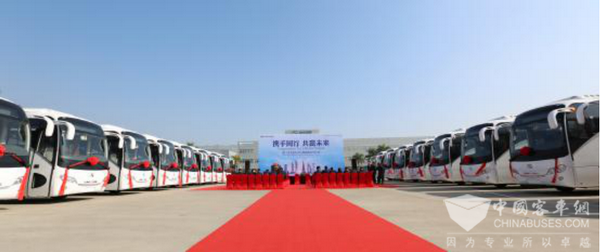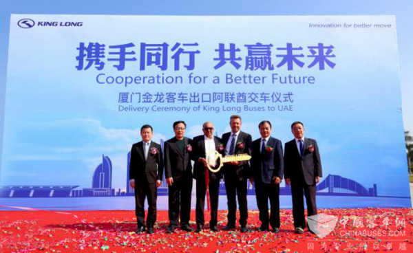 “携手同行,共赢未来”。2019年1月23日,金龙客车出口阿联酋交车仪式在金龙客车厦门厂区举行,仪式上,66辆崭新的金龙豪华旅游中巴交付阿联酋客户,该批车辆将于近日装船启航阿联酋投入运营。