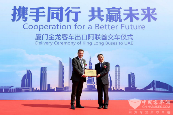 “这是我们与金龙客车合作以来最大批量的一次订单交付。从2008年销售8辆车开始,到2018年实现当地销售200多辆,金龙客车已成为阿联酋及海湾地区第一大客车品牌。”交车仪式上,来自阿联酋的经销商AG汽车贸易公司首席执行官麦克拉斯基回顾双方合作历程,并表示:“在多年的合作中,金龙用实力证明其产品不仅能有效应对阿联酋极端条件,并在不间断长途运营中保持最佳的状态。凭借优质的产品以及高效的服务,我们对下一个十年的合作充满信心!”