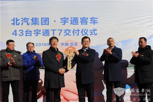 2019年2月15日,43台宇通高端公商务车T7正式交付北京北汽出租汽车集团有限责任公司(以下简称“北汽集团”),北京北汽出租汽车集团有限责任公司董事长张峻峰,宇通客车营销副总监王文韬等领导出席了交车仪式。