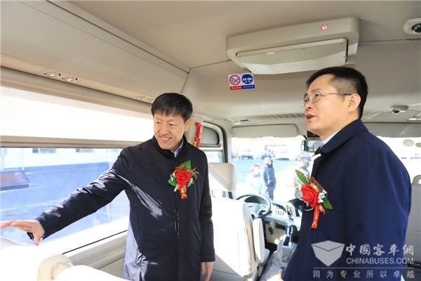 宇通客车营销副总监王文韬(右)向北汽集团董事长张峻峰(左)介绍宇通T7车内设计