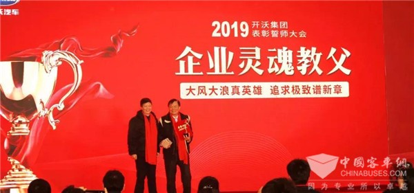 职工代表梅路强为开沃集团创始人、董事长黄宏生(右)颁奖:“企业灵魂教父”