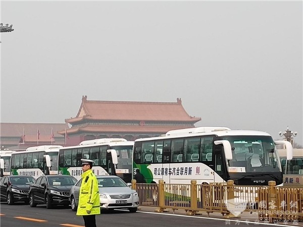 停靠在天安门广场的福田欧辉纯电动客车护航车队