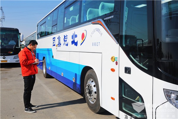 检修人员正在检修即将出征的福田欧辉客车