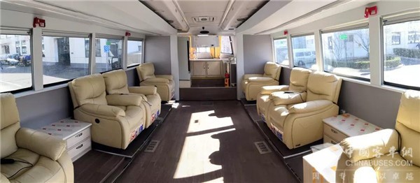 此批车辆中最具特色的当属成分采血车,因成分采血比采全血的时间更长,对环境、设备的稳定性等要求较高,为保证献血人员的舒适性,金龙成分采血车采用美国进口左右滑移仓,在国外,它往往被用在军工指挥车上面,欧美顶级房车上也可见其身影。滑移舱的安装位置颇费匠心,它被设计在等候区域——传统12米客车宽度一般为2.55米,但滑移舱打开后,车内宽双滑移约达4米,再配以2.25米的车内高度,采血车的舒适空间正受益于此。此外,它配备国内领先的釆血泵以及血小板震动箱,完美实现成分釆血全流程。为保障献血及釆血人员的舒适感,成分采血车还配备了全自动车身平衡装置。