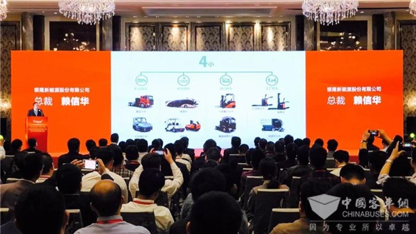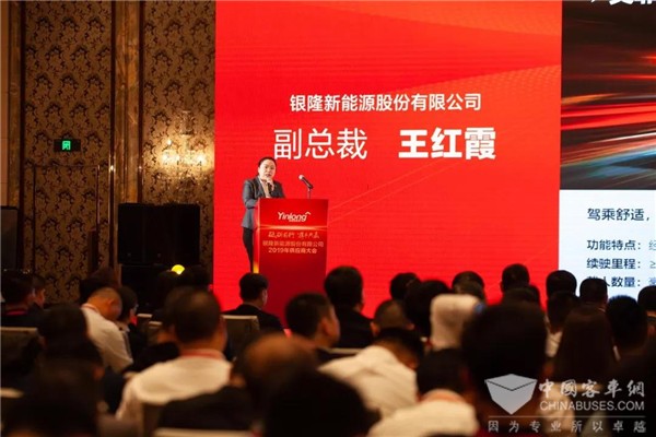 在大会上,银隆新能源副总裁王红霞向大家介绍了公司2019年“4大4小”的产品战略规划。“4大”,即为城市公交车、城市道路公路车、城市商品配送车、城市环卫车;“4小”,即为矿山、机场、港口、工厂仓储等特定场所的系列车辆。