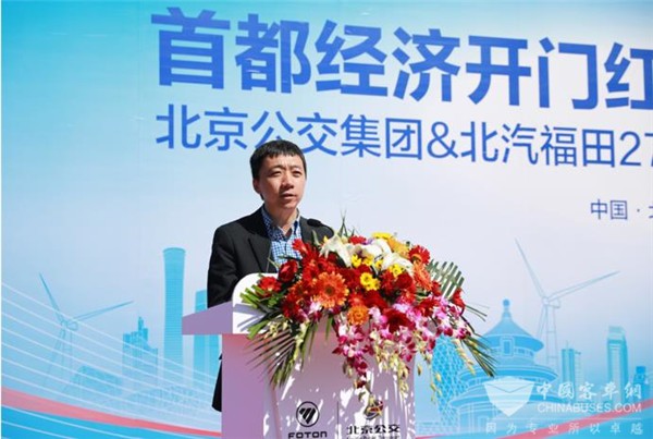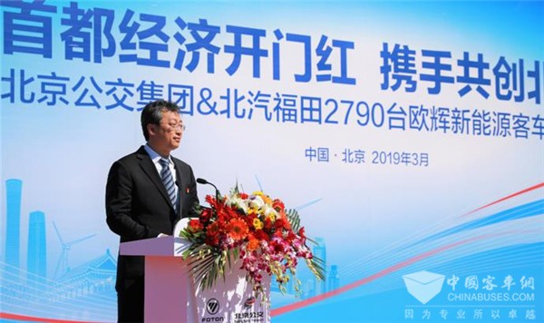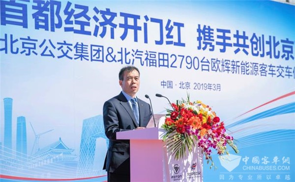 北京公交集团总经理朱凯也在交车仪式上发表讲话,并谈及与福田汽车的战略合作伙伴关系:北京公交集团积极落实《北京市清洁空气行动计划》和《蓝天保卫战行动计划》,努力发挥国有大型企业主力军作用,将绿色公交作为集团“十三五”发展重点,大力推进新能源、清洁能源车辆发展,全力为减少PM2.5及各类有毒有害物质排放,打赢北京蓝天保卫战贡献力量。北汽集团是新能源汽车市场领先的国有大型汽车企业集团,更是公交集团最大的战略合作伙伴。2016至2018年,公交集团累计采购福田欧辉客车6466辆,采购金额达101亿元。随着此次2019中国新能源客车第一大单的交付,公交集团与福田汽车将进一步拓展合作领域、创新合作模式、扩大合作规模、共享发展机遇,携手开创共同发展繁荣的美好明天。