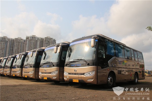 海汽集团旅游客运分公司(简称“海汽旅游公司”)服务保障用车中,选择了金旅客车XML6757、XML6807、XML6907这三款车型,其中有8辆XML6907是该公司今年新投入的LNG清洁能源客车。