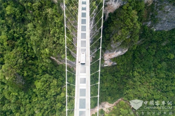 本次在玻璃桥上进行行驶挑战的无人驾驶巴士,是由深圳市海梁科技有限公司自主研发的“阿尔法巴”智能驾驶巴士,能够实时对道路使用者和突发状况做出反应,可供25人乘坐,最高时速40公里,单次续航里程可达150公里,具备人工驾驶和自动驾驶两种模式,张家界大峡谷景区将引入该款无人驾驶巴士,开通首条无人公交运行线路:从玻璃桥的停车场到玻璃桥桥头,以供游客乘坐。