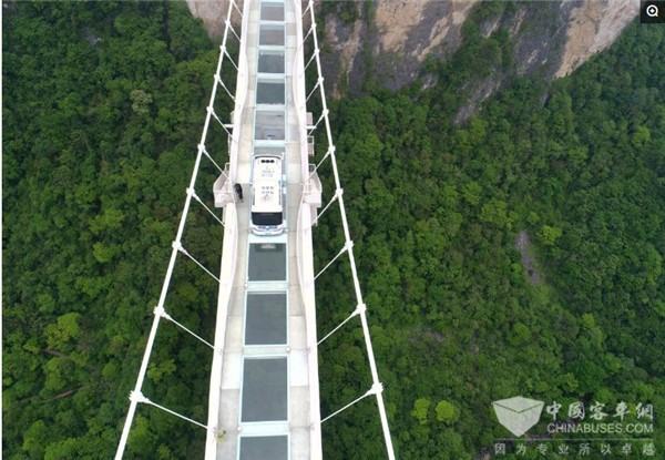 2019年4月24日,拥有十个“世界第一”的湖南张家界大峡谷玻璃桥上上演了一场“云天渡无人巴士悬浮魔幻秀”,除了倍加奇妙的魔术师“身体悬浮”表演外,安凯无人驾驶巴士首次亮相,成为关注焦点。