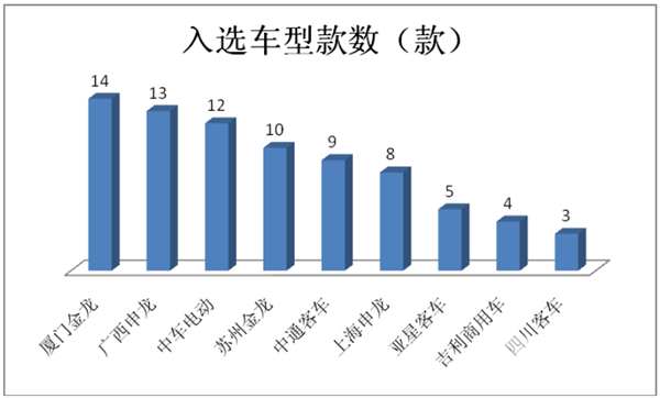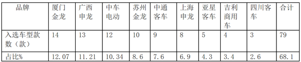 一、厦门金龙、广西申龙、中车电动位列前三,前9名入选车型企业占比68.1%