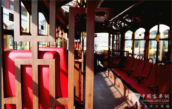 外形采用民国时代机车传统造型,融合济南画舫特色;内饰采用中式屏风、仿古家具、济南老照片,体现济南千年古城的深厚底蕴。走进车内,浓浓的民国风扑面而来,圆顶玻璃、皮革内饰、木质座椅……让人瞬间有种穿越回民国的感觉。