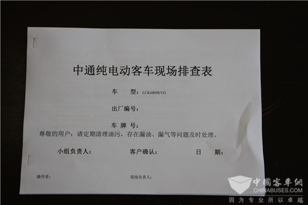 当然,排查范围外的车辆依然被认真对待,中通客车将做好的《排查作业指导书》送至客户手中,经客户签字确认后,引导客户自行排查,并跟踪搜集问题,一并列入排查总结中。