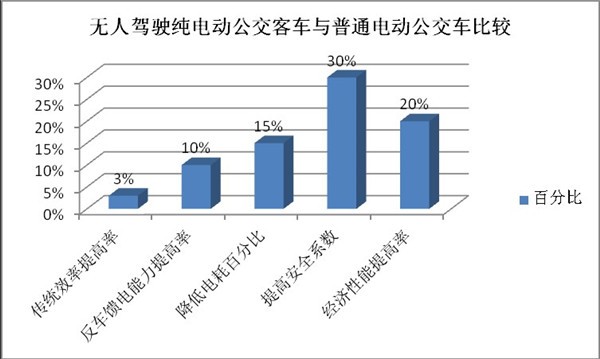 3.提高公共交通安全水平等多项综合性指标。率先在公交体系实现智能化无人驾驶,可以实现降低公交车在复杂的城市环境中的不安全因素,提高各种综合性能指标。无人驾驶公交客车采用夜视摄像头与毫米波雷达的“超融合,能主动识别天气、路面、周边环境等多重因素,可实现白天、夜晚的智能驾驶功能,可清晰地对复杂路面进行感知,因此在提高安全系数,传动效率、反车馈电能力、有效降低电耗、降低运行成本和提高经济性等指标方面都有明显的优势。经权威专家测算,一辆无人驾驶的电动公交客车与同车长的普通纯电公交客车在提高传动效率、反车馈电能力、降低电耗等方面的数据比较如下图(数据来自公开资料):