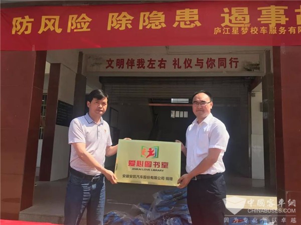 2019年6月14日,“百城千校”安凯校车公益行——爱心图书捐赠活动温情启程,走进安徽省合肥市庐江县金牛小学,在为孩子们带来书包、文具、书籍等爱心物资、成立爱心图书室的同时,安凯联合庐江星梦校车服务有限公司开展校车安全教育活动,共同助力金牛小学的孩子们筑梦快乐成长。