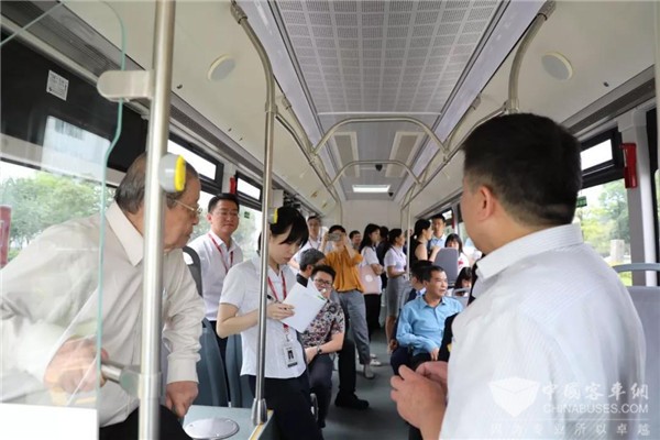 考察团还登上了纯电动智能客车试乘。乘用车化的内饰、舒适的座椅、人性化的功能让林吉祥一行留下了深刻的印象,他由衷地赞叹中车电动客车强大的研发实力和先进的造车工艺。