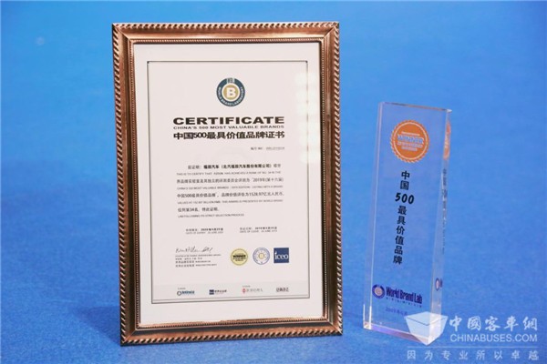 2019年6月26日,2019年第十六届世界品牌大会暨2019年(第十六届)中国500最具价值品牌发布会在北京举行。其中,福田汽车品牌价值继续向上,突破1500亿元,以1528.97亿排行第34位,连续15年位居商用车行业第一、汽车行业第四。