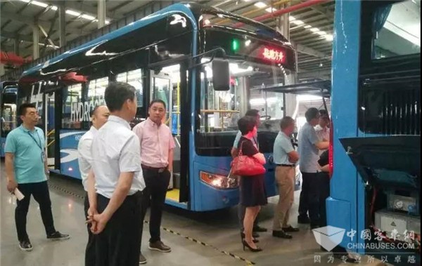 2019年6月20日上午,由中国汽车工程学会副秘书长王菊带队,北京大学教授、新能源专家库专家黄勇作为审核组组长,上海机动车检测技术中心潘相敏总工程师,湖南大学教授、新能源专家库专家雷飞组成的审核组一行莅临陆地方舟,考察公司氢燃料电池客车技术产品发展应用成果,对该批交付的5台氢燃料客车进行审核。经济开发区党工委委员、管委会副主任赵宏祥和氢能源产业园管委会主任赵巍等相关领导陪同参与审核。