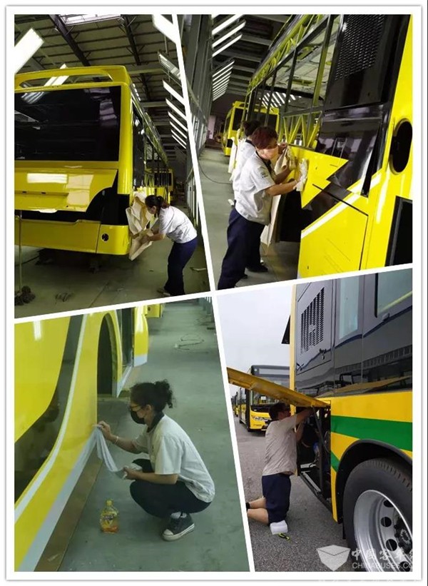 从接到订单以来,短短几个月时间,哈尔滨这批车的生产任务制件车间已全部完成,但我们并未开始享受胜利的喜悦,其它车间生产难任务急的时候,我们义不容辞能帮就帮。在501台车接近尾声时,制件车间派出4名女员工到涂装车间承担贴腰线工作,每天和涂装生产员工一样加班至当天生产任务结束。贴腰线的工位是细工活,光线必须要明亮,灯光的热度加上天气炎热,员工每天都是一身汗连着一身汗。夜间加班蚊虫的叮咬也给这些女员工的身上留下了一串串大红疙瘩。