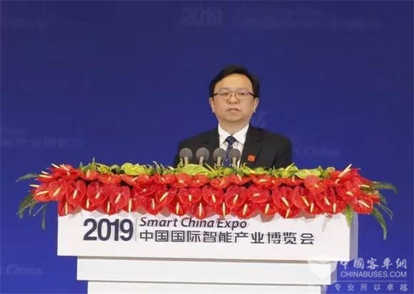 2019年8月26日,由科技部、工信部、中科院、中国工程院、中科协和重庆市政府共同主办的2019中国国际智能产业博览会在重庆召开,吸引了近60个国家和地区的代表参会,与会嘉宾包括国际组织负责人、诺贝尔奖得主等国际知名学者和60多位世界500强企业高管等。国家主席习近平致贺信,国务院副总理刘鹤代表宣读贺信并作重要讲话。王总受邀出席大会,围绕“电动化与智能化、立体智能大交通”两大方面作了发言。
