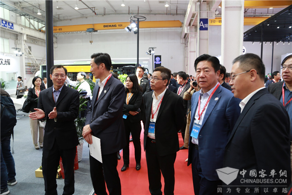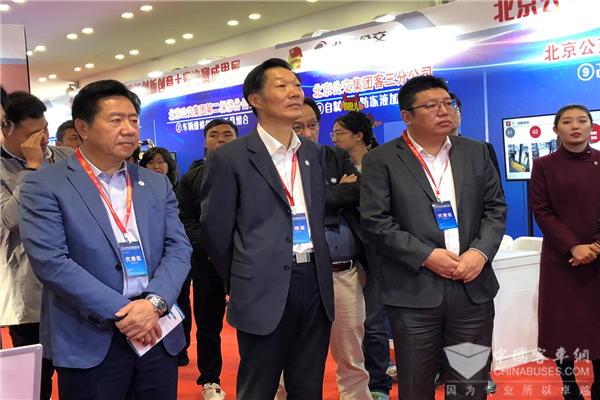 中国道路运输协会城市客运分会理事长 王春杰、北京公交集团总经理 朱凯、福田汽车集团业务副总裁、欧辉客车事业部党委书记、总裁 梁兆文 共同参观展区