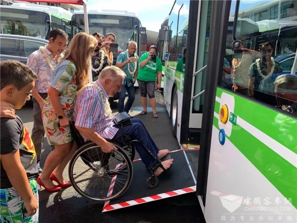 值得注意的是,每辆大巴均配备了无障碍服务设施。在规定的区域内设有专用座椅,划有单独的轮椅区间,出入口设计了低地板导板,可倾斜的坡道以降低离地间隙,方便行动不便的乘客上下车。此外,乘客还可以通过智能手机应用实时了解公交车的到站情况。