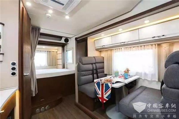 会客区设计有对坐式双人沙发座椅,并安装有三点式安全带,可保证其在行车时同时乘坐6人(包括驾驶员)中间则是一张可升降餐桌,同时该区域整体采用拓展式设计,上方是一排储物吊柜,内侧的推窗加装有隔光的纱帘。后方是一台内嵌是152L双开门冰箱。