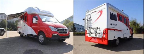 整车外形配合公司五十周年大庆采用的大面积红色喷漆,给人一种亮而不俗的感官,第一眼就能吸引众多路人眼球。据悉此台样车长度在6米之内,可容纳3-6人出行,满足了大部分C照驾驶员拥有房车的幻想。从车头延伸出去的红色拉花线条流畅,使得整车外观统一且年轻化。整车的外观采用现在房车较为流行的小额头设计,小额头尺寸小巧,前侧突出也很短,为驾驶舱上方视野也留出了更多空间,流线型的额头造型减小了风阻,使得驾驶起来更加舒适。车体外部配备了遮阳棚和便携式外置厨房身处美丽的风景外做饭也是一种不错的体验。整车的外壳采用的是同欧洲房车同步的三明治车身压层工艺,采用房车最新的压板技术,车厢两边玻璃钢中层采用高等级的泡沫板填充,具有保温隔热、隔音降噪的性能,玻璃钢一体车型无缝衔接高效防水,车身框架结实耐用,安全又可靠,无论什么天气环境都能在房车中舒服的睡上一觉。
