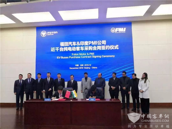 2019年12月20日,福田汽车与印度PMI公司纯电动客车批量订单采购协议签约仪式在北京隆重举行,北汽集团、福田汽车、印度PMI公司高层出席签约仪式。此次签约后,将有近千台福田欧辉纯电动客车陆续交付印度,助力印度交通运输行业向新能源转型升级。