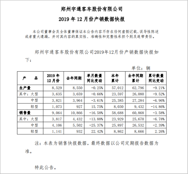 2020年1月5日,郑州宇通客车股份有限公司公布了2019年12月份产销数据快报。数据显示,宇通客车2019年1-12月累计生产各型客车57012辆,同比下降9.21%;累计销售客车58688辆,同比下降3.58%。