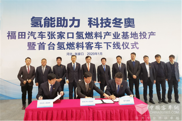 2020年1月19日,以“氢能助力 科技冬奥”为主题的福田汽车张家口氢燃料产业基地投产暨首台氢燃料客车下线仪式在张家口宣化区举行。张家口市长武卫东,张家口常务副市长郭英,张家口市秘书长张爱民,宣化区委书记张聪,宣化区长费再宏,福田汽车集团党委书记、总经理巩月琼,福田汽车集团副总经理杨国涛,福田汽车集团业务副总裁、欧辉客车事业部党委书记、总裁梁兆文,福田汽车集团品牌副总裁李健,北京公交集团首席资本运营官傅世学,北京亿华通科技股份有限公司董事长张国强等相关领导以及行业媒体代表出席本次活动。