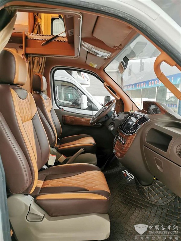 C型房车额头设计为双人床,宽度2米以上完全可以满足两名成年人休息,32寸车载网络电视采用翻转设计,行车过程中放平,驻车时可以翻转后观看电视节目或通讯K歌系统。