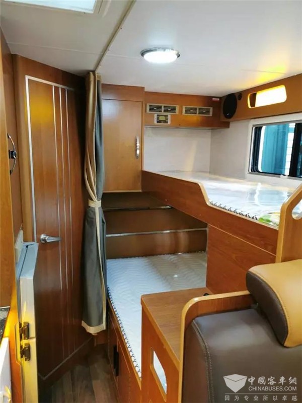 车尾采用子母床上下铺设计,可以满足三名成年人休息,充分利用空间设计有衣柜等。