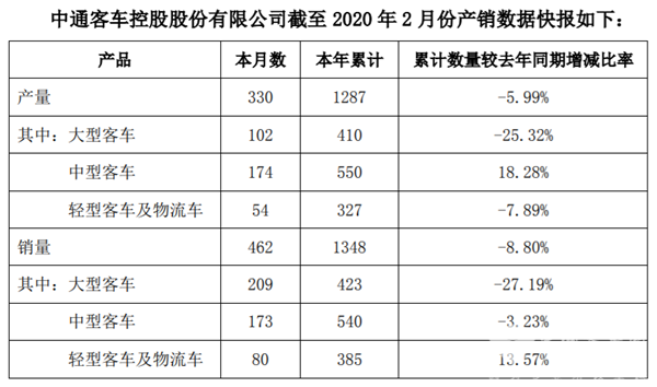 2020年3月6日,中通客车控股股份有限公司(简称:中通客车)发布2020年2月份产品产销数快报。快报显示,前2月,中通客车累计销售各类车型1348辆,同比下降8.8%;生产各类车型1287辆,同比下降5.99%。
