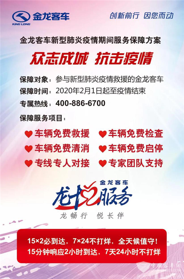 2020年1月起,金龙客车正式推出以“龙畅行,悦相伴”为核心的“龙悦服务”品牌。疫情发生后,金龙客车迅速作出调整,在“龙悦”服务原有“15分钟响应,2小时必达,7×24小时全天候值守”的基础上再细化、再部署。