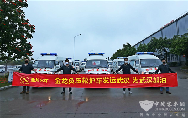 2020年2月14日,首批40辆金龙客车负压救护车搭乘救援特货专列千里驰援武汉,与一线医护人员并肩同行抗击疫情。目前,金龙客车负压救护车已投入武汉、孝感、随州、荆州、宜昌、十堰、黄石、鄂州、黄冈等地医院及急救中心运营。同时,金龙客车正紧锣密鼓地赶制沙特及防疫专用车等订单,大家正以昂扬的干劲全力生产,为生命护航。