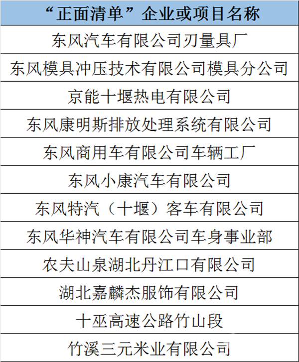 新闻发布会公布了十堰市首批环境监督执法正面清单,58家企业或项目纳入其中。对编入正面清单的企业和项目,十堰将予以优先保障或采取减少、免除现场检查等措施,以全新方式发挥生态环境守法企业在日常监管中的正面激励和示范效应,促进企业自觉守法。