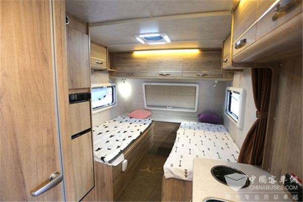 箱体前部主休息区双人大床尺寸:2*1.8m,四周设有推窗保证采光透气。