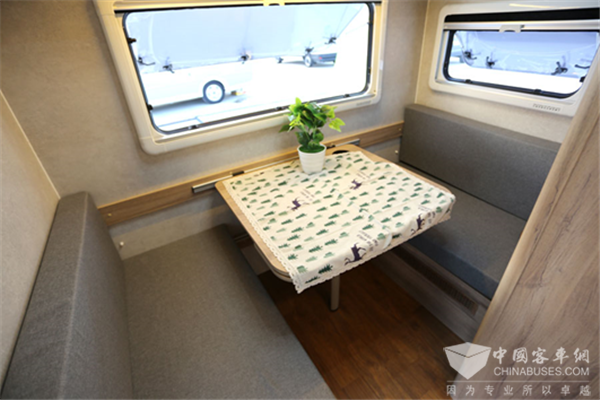卡座会客区位于箱体后部,两张对坐式卡座沙发中间是一张折叠餐桌。