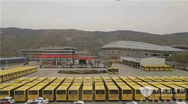 明黄色的车身,相间着蓝色波纹的“外衣”,一排排崭新的新能源客车显得格外亮眼……