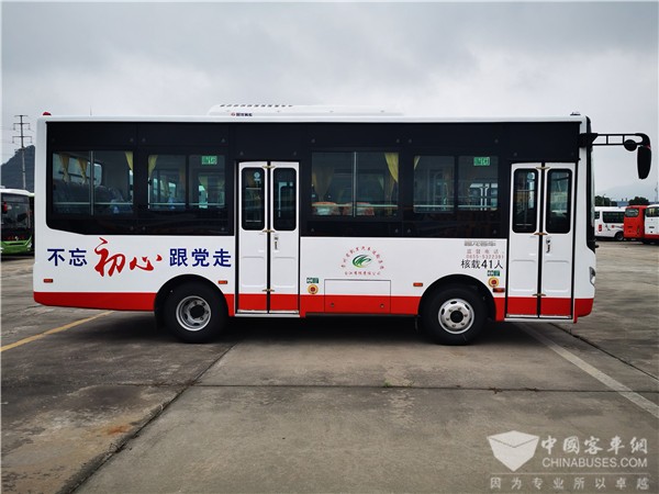 按照台江运输公司的要求,此批超龙客车涂装是全部采用定制化,在设计上东风超龙也融入诸多元素。在外形上以白色为主基调红色涂装相间,突出“不忘初心跟党走”的标识,全方面的展现了台江运输公司对党建文化的重视,更表明了献礼建党99周年的决心。