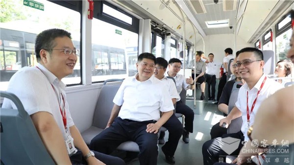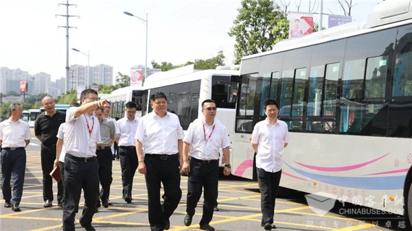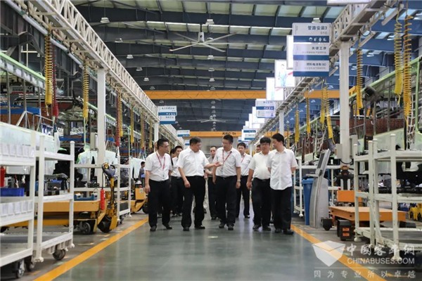 余卫平首先来到公司总装车间。生产线上的“新巴客”涂装精致,流水线作业井然有序,一派繁忙景象。他边走、边看、边听,仔细观察各工位组装工艺,详细询问公司市场运营、生产工艺、产品规划等情况。