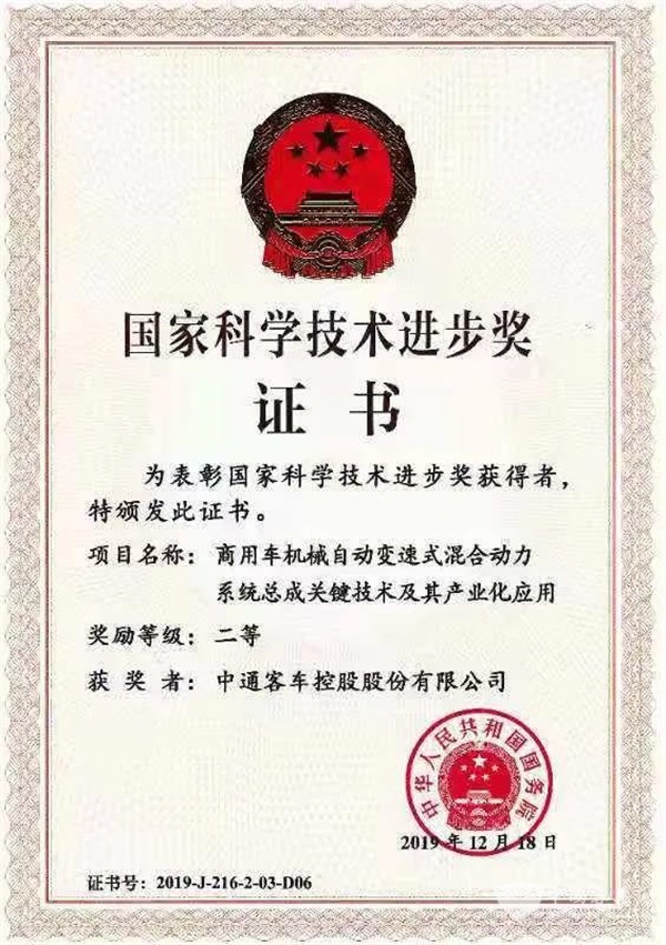 2020年,中通客车载誉不断,早在1月10日,中通客车凭借“商用车机械自动变速式混合动力系统总成关键技术及其产业化应用”项目,获得国家科学技术进步奖二等奖。