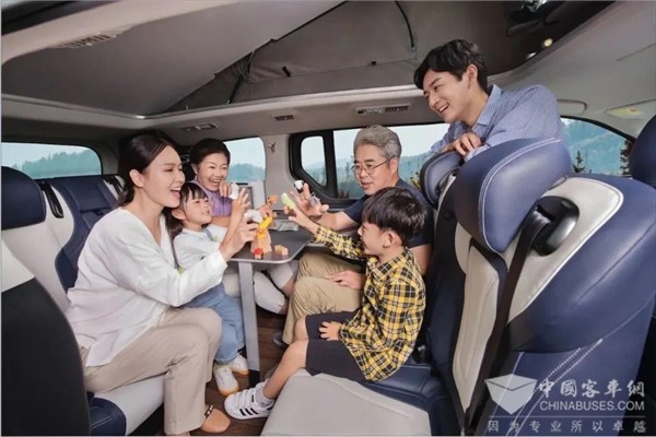 内饰部分是MAXUS RG20的重头戏,车内配有床铺、冰箱、办公桌、花洒淋浴等,座椅采用2+2+2形式6座布局。可一键控制升顶,提供一上一下,两个长2.1米,宽1.1米的露营睡眠空间,车内高度增加近1米 ,就像多了一间可移动的民宿;集成了人体工学设计的冰箱、饮水机、洗手池;拥有二、三排对向座椅布局,配上翻折式的活动桌,将家中客厅功能,能轻松移动到沿途美景之中。