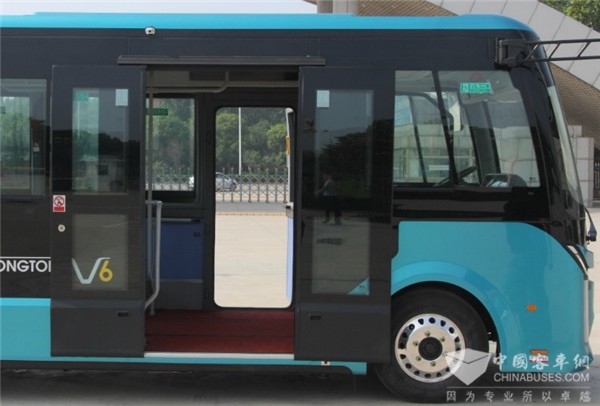 睿通V60属于短前悬短后悬长轴距车型,轴距达到3850mm,对比普通6米车型轴距足足长了700mm,这就大幅增加了车内乘客区的面积,提升了有效载客空间。同时,长轴距的车型更利于搭载低地板,实现了一级踏步、大通道,车厢前后空间布局也更加合理。为满足不同工况需求,也有两级踏步车型可选;左侧标配安全门,增加逃生通道;可选装电动塞拉门,换乘更便捷;可选轮椅导板,满足人性化需求。