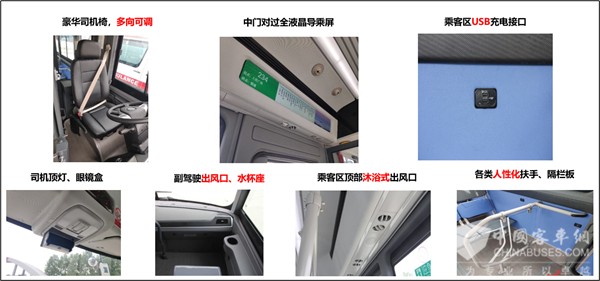 同时,车内还配有司机隔栏板、主副驾驶水杯座、储物盒、医药箱、阅读灯、眼镜盒、电子钟、下翻式遮阳板、立体式空调出风口、全液晶导乘屏、人性化扶手、USB充电接口等人性化设施,给司机和乘客最细心的呵护。