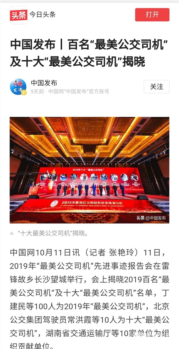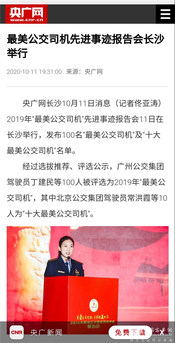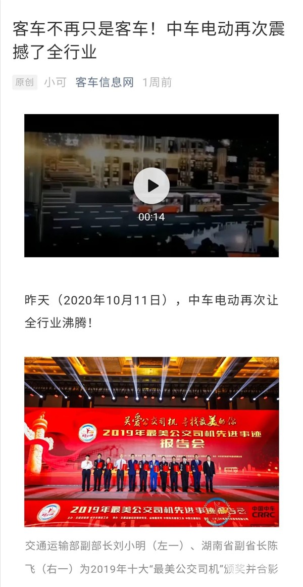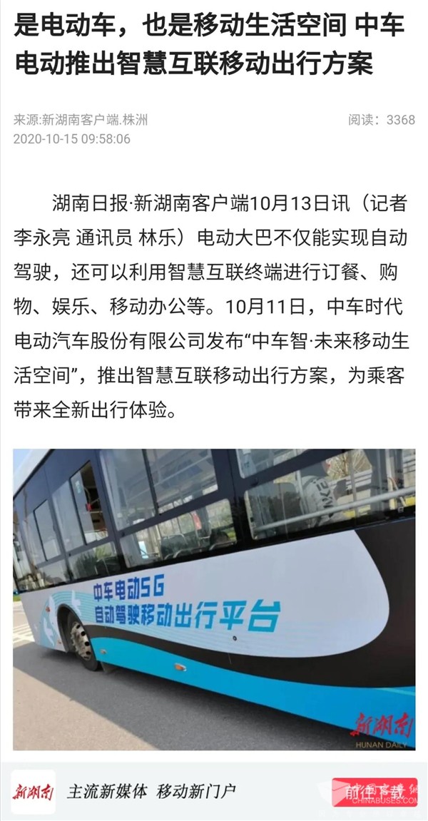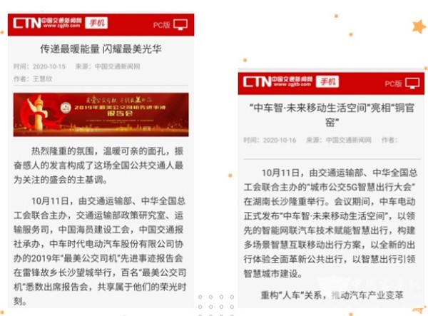 近日,“全国最美公交司机先进事迹报告会”和“城市公交5G智慧出行大会”在湖南长沙隆重举行。会议期间,“全国最美公交司机”先进事迹和“中车智·未来移动生活空间”吸引了人民日报、新华社、中国交通报、光明日报、中国网、澎湃新闻、香港商报、湖南卫视、湖南经视、湖南日报、红网、XINGKONG.COM、客车信息网、道路运输网等等100余家媒体纷纷争相报道。