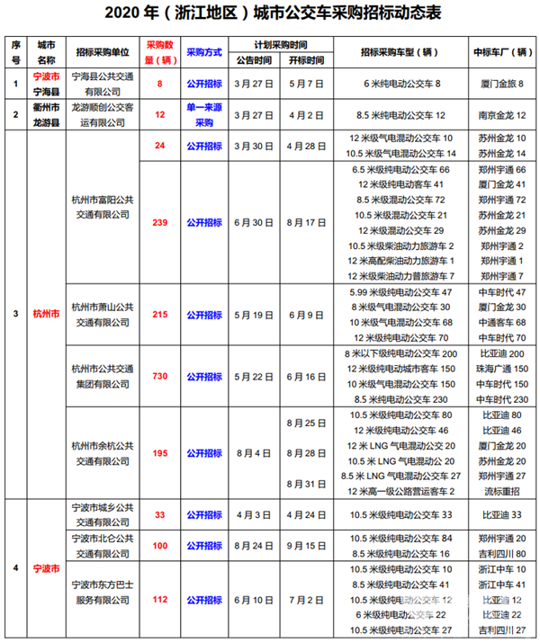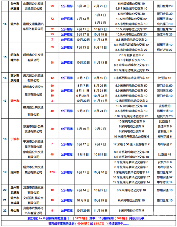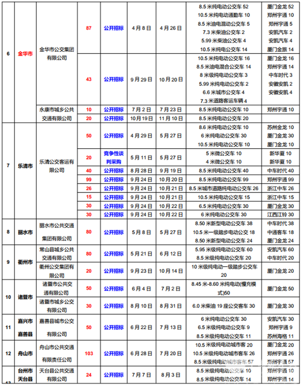 值得一提的是,嵊州市公共交通有限公司于11月13日发布了58台公交车批量招标信息,其中,囊括22台传统柴油城乡公交车及36台纯电动城乡公交。最终这批订单花落谁家让我们拭目以待。此外,舟山市六横环岛汽车客运公司和永康市城乡公共交通有限公司也将于11月19日及11月10日发布招标结果,参与此次招标的客车单位请留意关注。