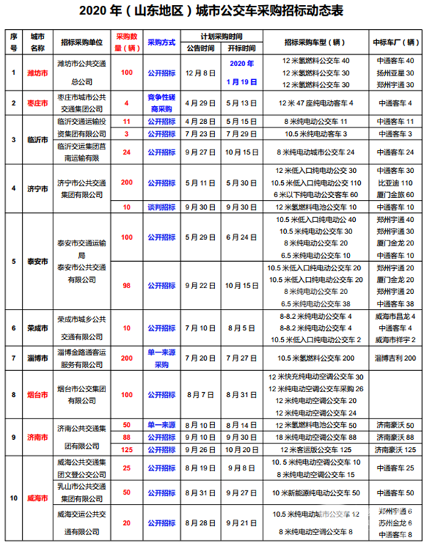 招标研究:2020 年1—10月山东地区公交客车招标汇总参考