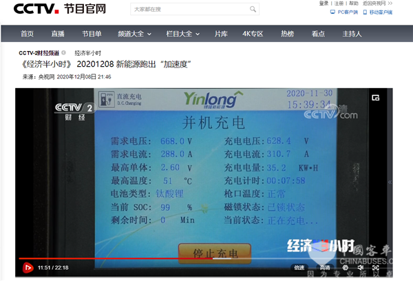 在《经济半小时》节目中,银隆公交车在顶充设备之下,充电三分多钟,剩余电量就由33%上升到60%以上,仅仅8分钟,银隆公交车的电量就充满了,显示为99%。要知道,一直以来,新能源电动汽车充电慢、放电快的问题便制约着新能源汽车的发展,凭借自主研发的钛酸锂电池技术,银隆新能源为此提供了有力解决方案。